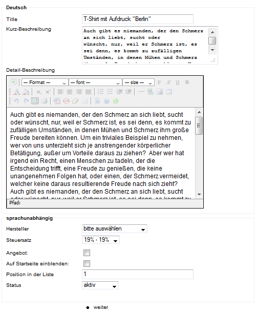 Artikel hinzufügenUm das Eintragsformular für einen Artikel aufrufen zu können, gibt es unterhalb der Artikel-Liste den Link "Artikel hinzufügen".Die Einstellungen zu einem Artikel sind auf drei Seiten verteilt. Auf der ersten Seite können Sie den Titel und zwei Beschreibungstexte anlegen. Die Kurz-Beschreibung wird später in der Artikel-Liste aufgeführt und sollte daher entsprechend kurz sein. Ausführlicher darf dagegen die Detail-Beschreibung ausfallen. Der Name sagt es schon, dieser Text wird in der Detail-Ansicht eingeblendet. Im Hersteller-Menü sind alle Einträge aufgeführt, die Sie unter "Admin-Tools" ->"Hersteller " angelegt haben. Die Funktion hat aber im Shop noch keine große Bedeutung. Die Auswahl wird nirgendwo angzeigt. Es ist vielmehr ein Vermerk für Sie selbst. Mit einen Häkchen bei Angebot wird der Artikel in Rotation im Angebots-Block eingeblendet. Das Häkchen bei "Auf Startseite einblenden" bewirkt, dass der Artikel auf der Startseite gezeigt wird. Um den Artikel an eine bestimmte Stelle in der Artikel-Liste zu stellen, können Sie die Position bestimmen. Und wenn Sie nicht wollen, dass der Artikel öffentlich angezeigt wird, können Sie dessen Status auf "deaktiviert" setzen.