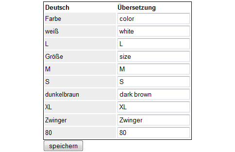 Ist eine Sprache ausgeblendet, ist sie im öffentlichen Bereich nicht auswählbar. Im Administrationsbereich werden aber weiterhin die Übersetzungstools eingeblendet. Optionen übersetzenDa gewisse Optionen wie Größe oder Farbe immer wieder benötigt werden, wäre es aufwendig, diese für jeden Artikel von Neuem zu übersetzen. Deshalb listet das Tool "Sprache ->"Optionen übersetzen" alle Optionen, die im Onlineshop verwendet werden, auf und Sie müssen diese in der rechten Tabellenspalte nur einmal übersetzen.